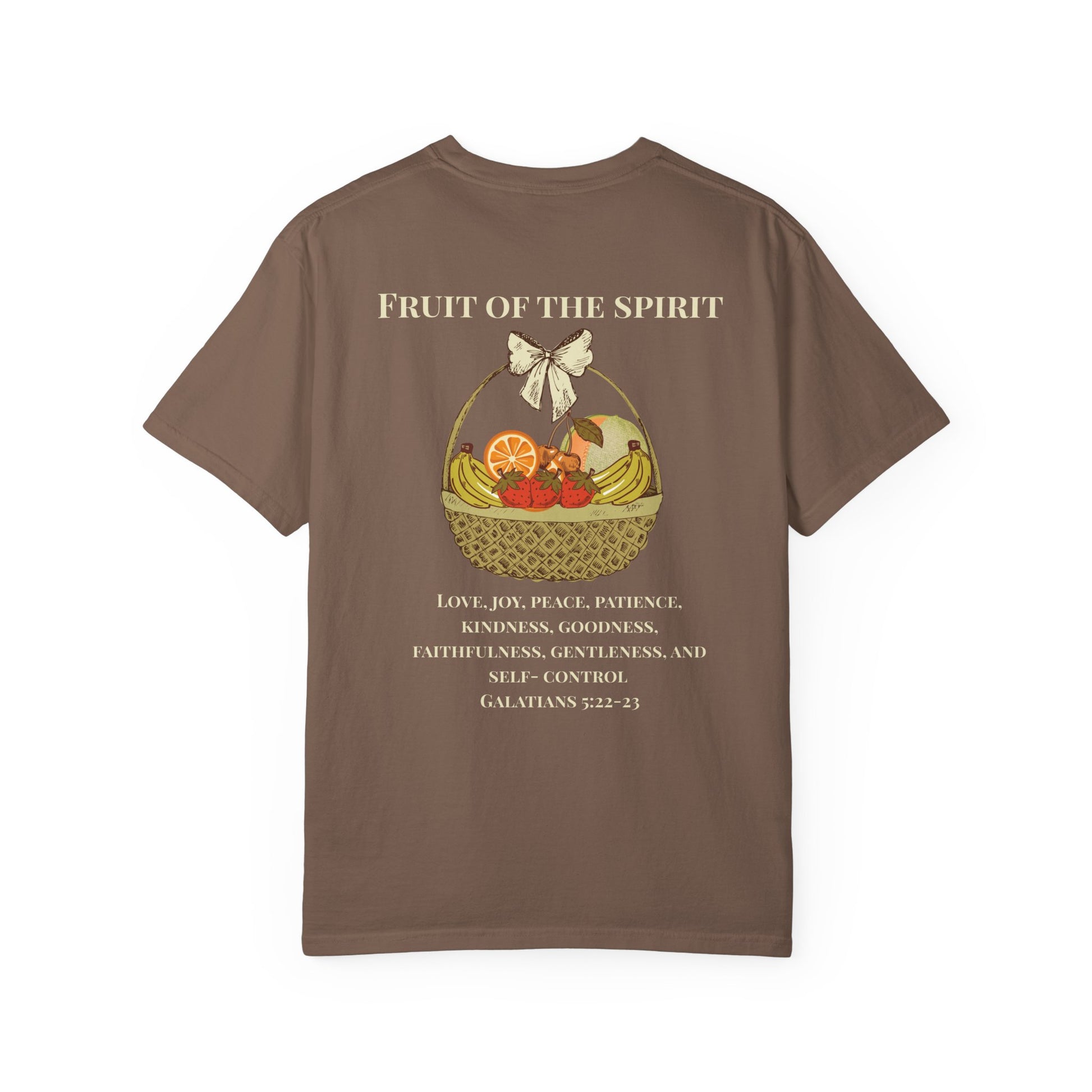 Reminisce on God's doing with our Fruit of the Spirit Christian t-shirt. Inspired by the passage from Galations 5:22-23, this fall graphic t-shirt depicts the fruit of the spirit with a fall twist. This fruit of the spirit christian tee is not just a piece of clothing, it's a reminder to live with love, joy, peace, patience, kindness, goodness, faithfulness, gentleness, and self- control. Perfect for fall bible study nights. Fits as unisex.
